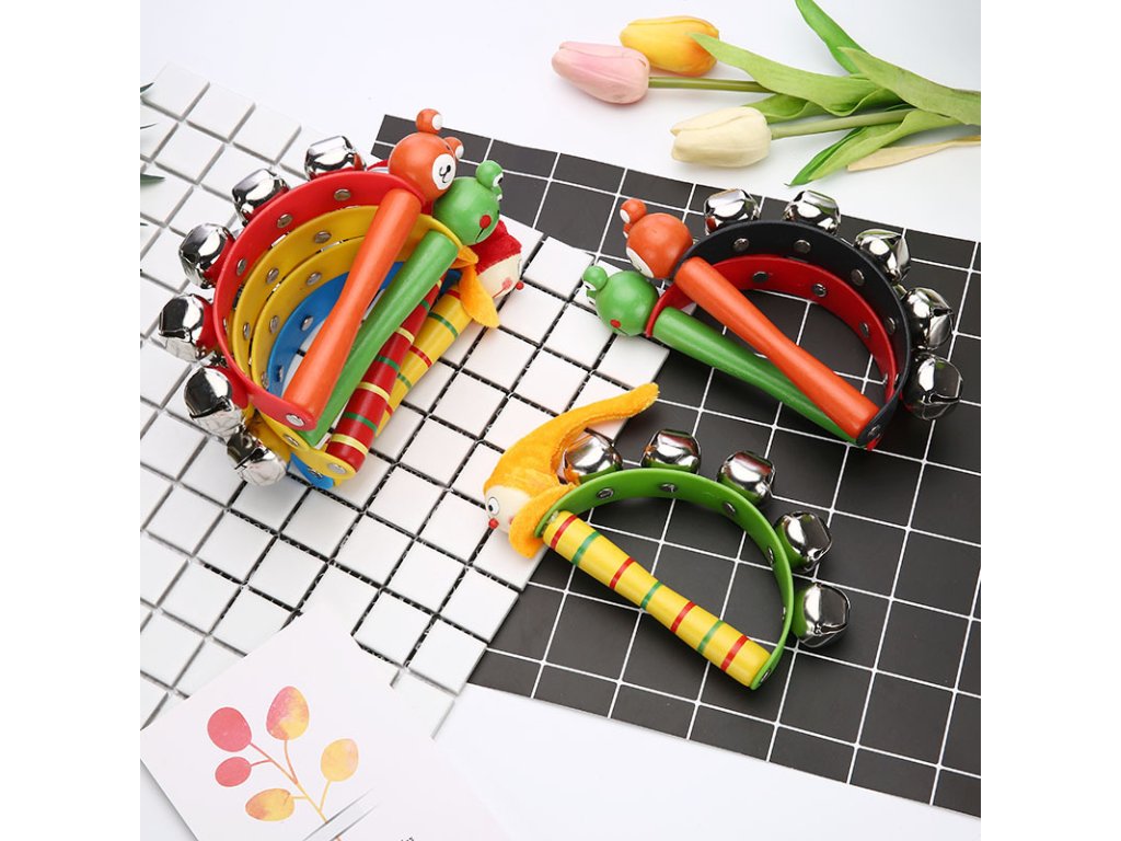 Hudební nástroj s plastovým obloukem zdobeným veselou hlavičkou zvířátka, doplněný kovovými rolničkami. Skvělý doplněk pro rytmickou výchovu a hudební zábavu. Prodává se po sáčcích po 12 ks
