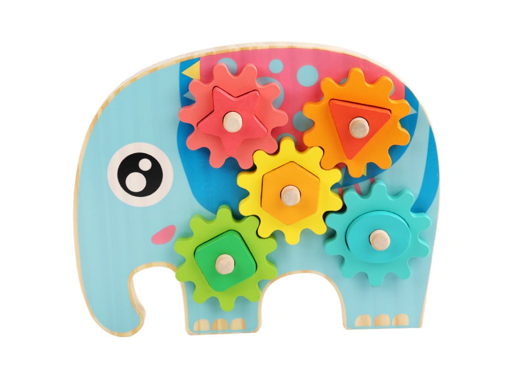 Barevná vzdělávací pomůcka ve tvaru slona s otočnými ozubenými kolečky, podporující rozvoj jemné motoriky a logického myšlení dětí.