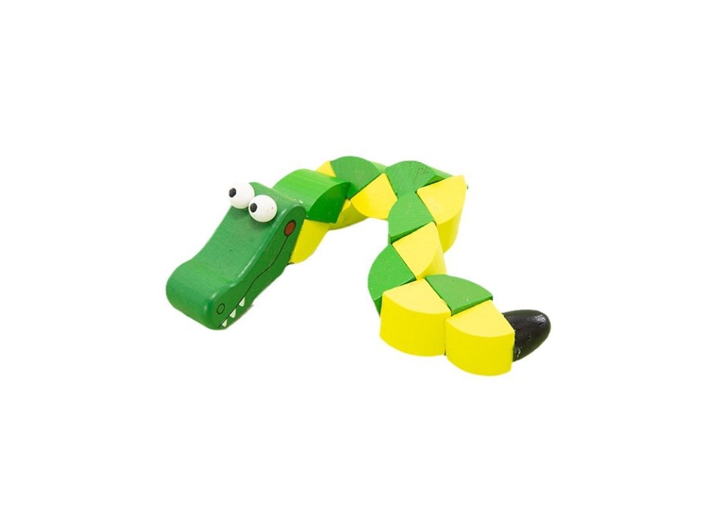 Barevný dřevěný had ve tvaru krokodýla, tvořený otočnými segmenty. Pohyblivý design podporuje motoriku a kreativní hru. Balení obsahuje 24 ks.