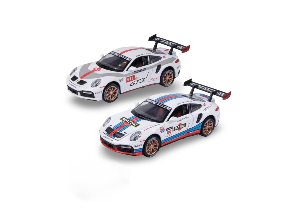 Precizně zpracovaný sportovní model s výrazným zadním spoilerem, otevíracími dveřmi, zpětným pohonem a pryžovými koly. K dispozici ve dvou závodních designech s bílým základem. Vyrobeno z kovu a plastu. Prodává se po sáčcích po 12 ks.