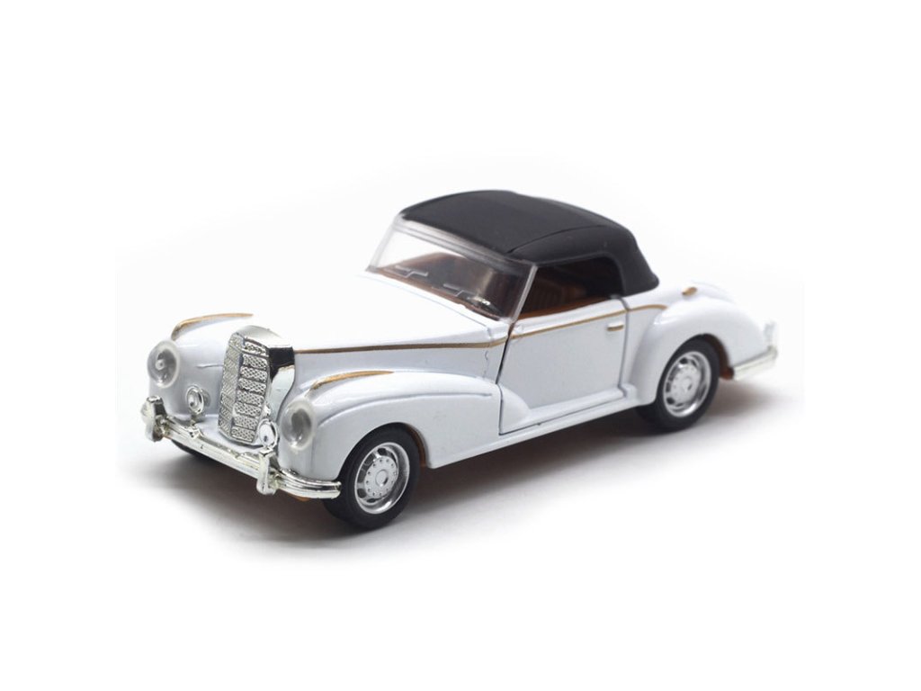 Plastový model klasického kabrioletu v bílém provedení s černou měkkou střechou a hnědým interiérem. Model má otevírací dveře, precizní detaily karoserie a zpětný natahovací pohon (pull-back). Elegantní retro design dělá z tohoto modelu atraktivní doplněk sbírky i zábavnou hračku.