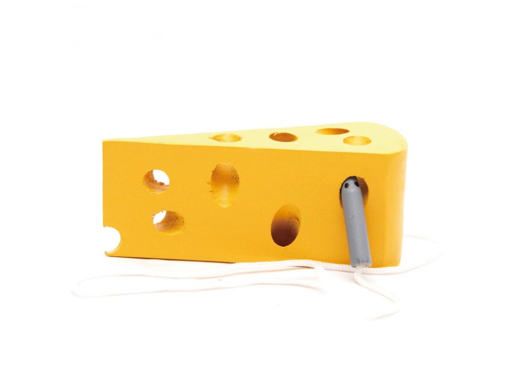 Dřevěný žlutý sýr s otvory a myškou na provázku k procvičování jemné motoriky. Skvělá hra pro trénink soustředění a trpělivosti. Balení obsahuje 12 ks.