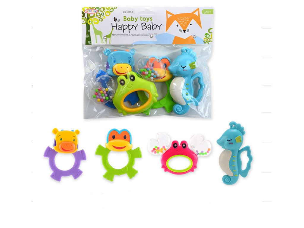Barevná sada chrastítek různých tvarů a postaviček. Lehké, snadno uchopitelné a vhodné pro stimulaci sluchu a hmatu nejmenších dětí. Určeno pro děti od 0 měsíců.