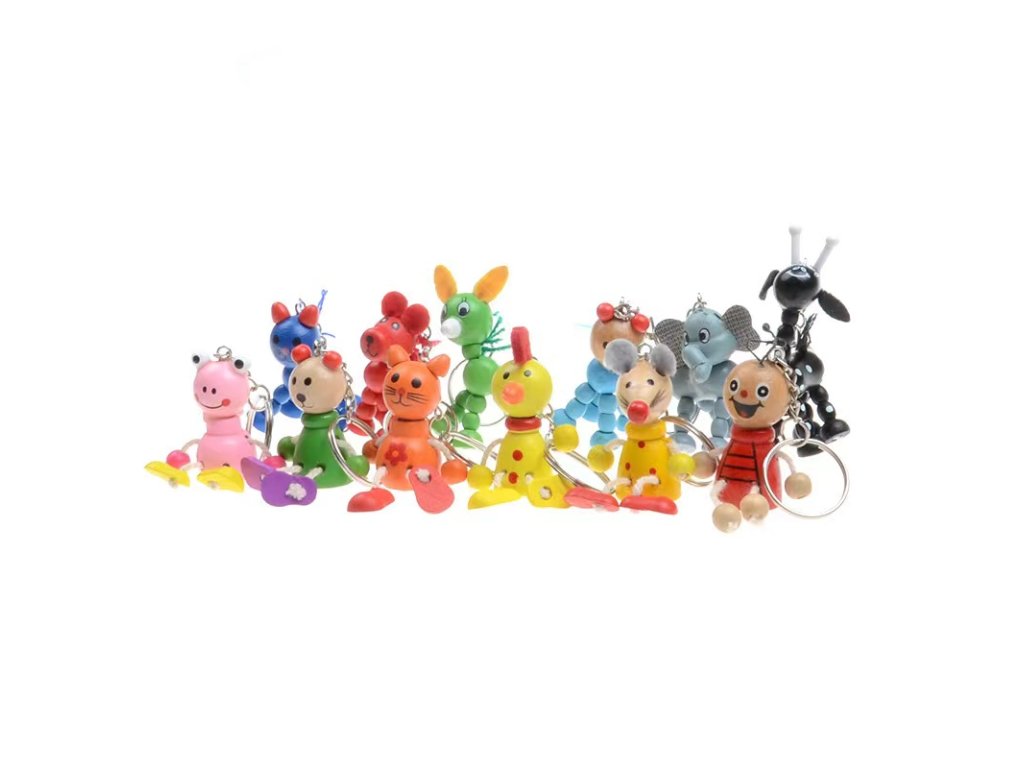 Veselé dřevěné postavičky s kovovým kroužkem pro použití jako přívěsek na klíče nebo batoh. Různé motivy zvířátek a postav, pohyblivé končetiny. Balení obsahuje 48 ks.