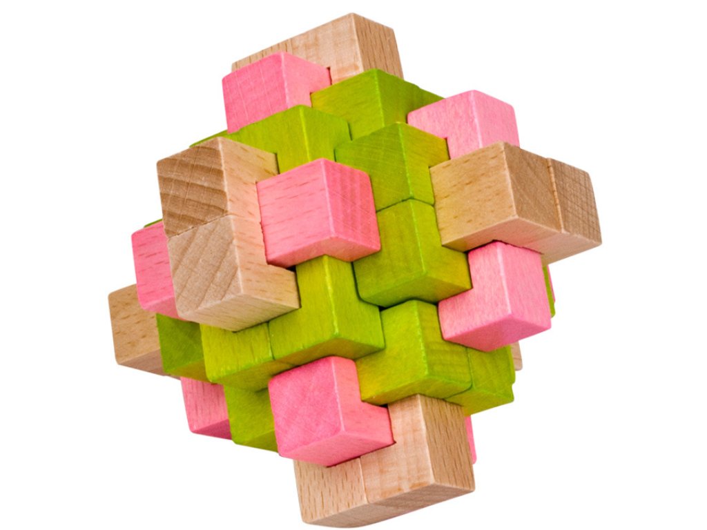 Prostorový hlavolam z barevných dřevěných dílků v přírodním, růžovém a zeleném odstínu. Komplexní konstrukce podporuje logické myšlení a trpělivost. Balení po 12 ks.