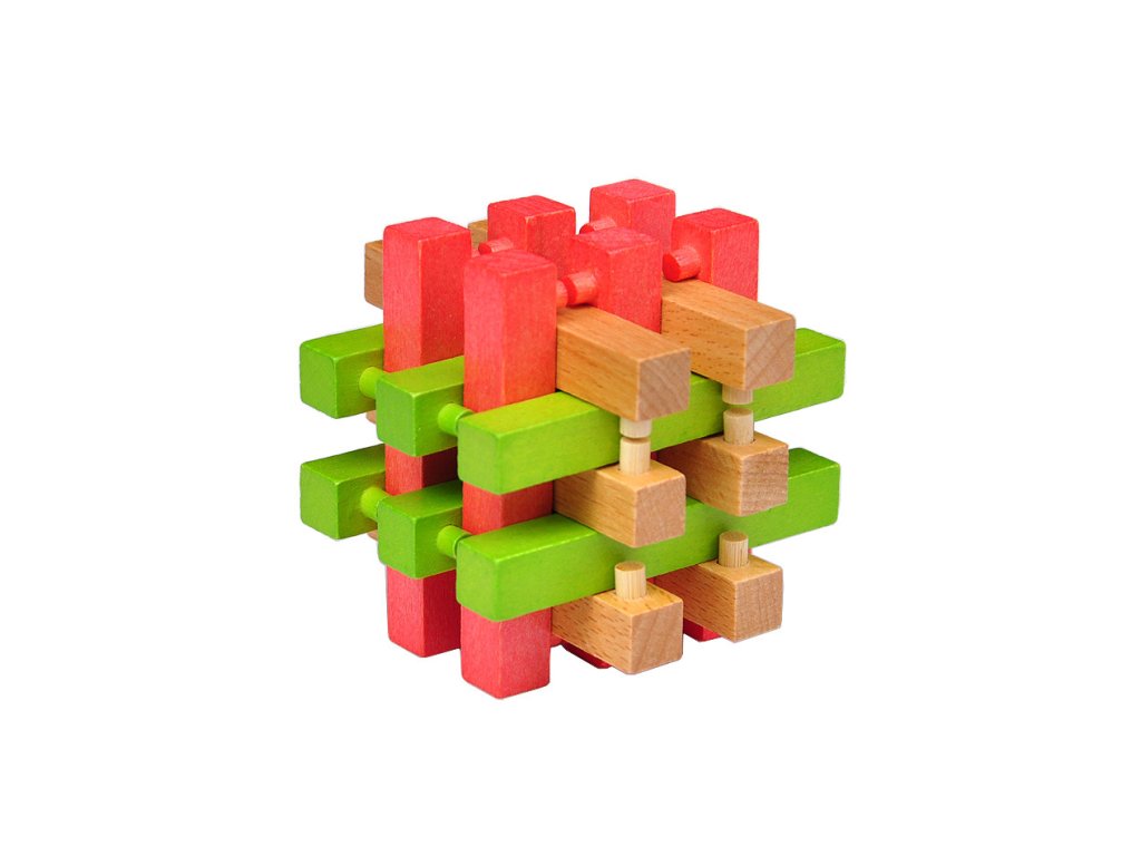 Hlavolam složený z barevných dřevěných tyček tvořících prostorovou mřížku. Procvičuje logiku, soustředění a zručnost. Balení obsahuje 12 ks v mixu barev.