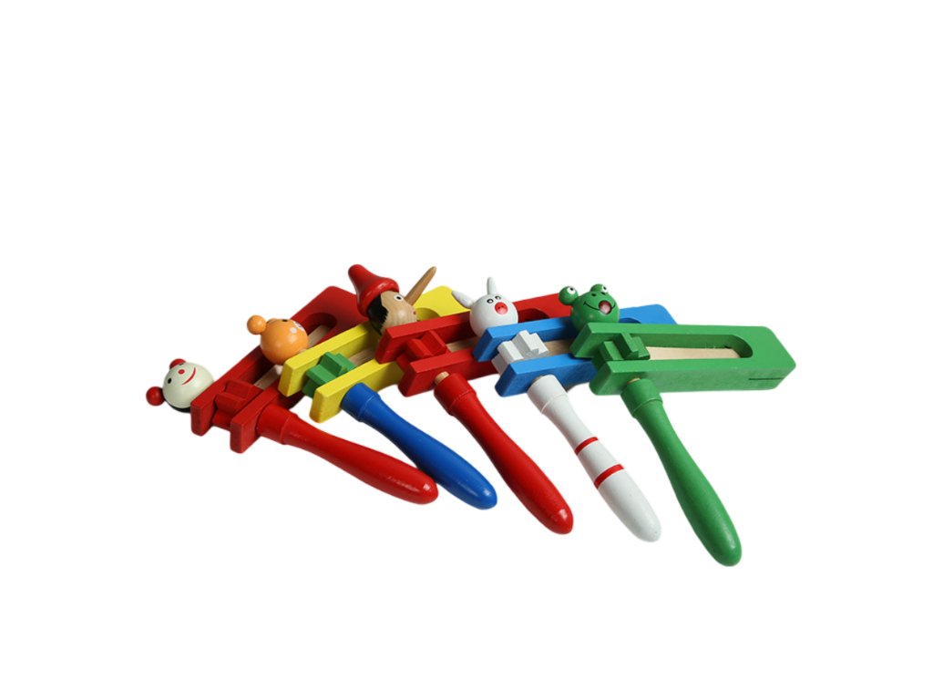 Tradiční dřevěné řehtačky s barevnými držadly a veselými figurkami zvířátek a klaunů. Při otáčení vydávají typický klepavý zvuk. Balení obsahuje 24 ks.