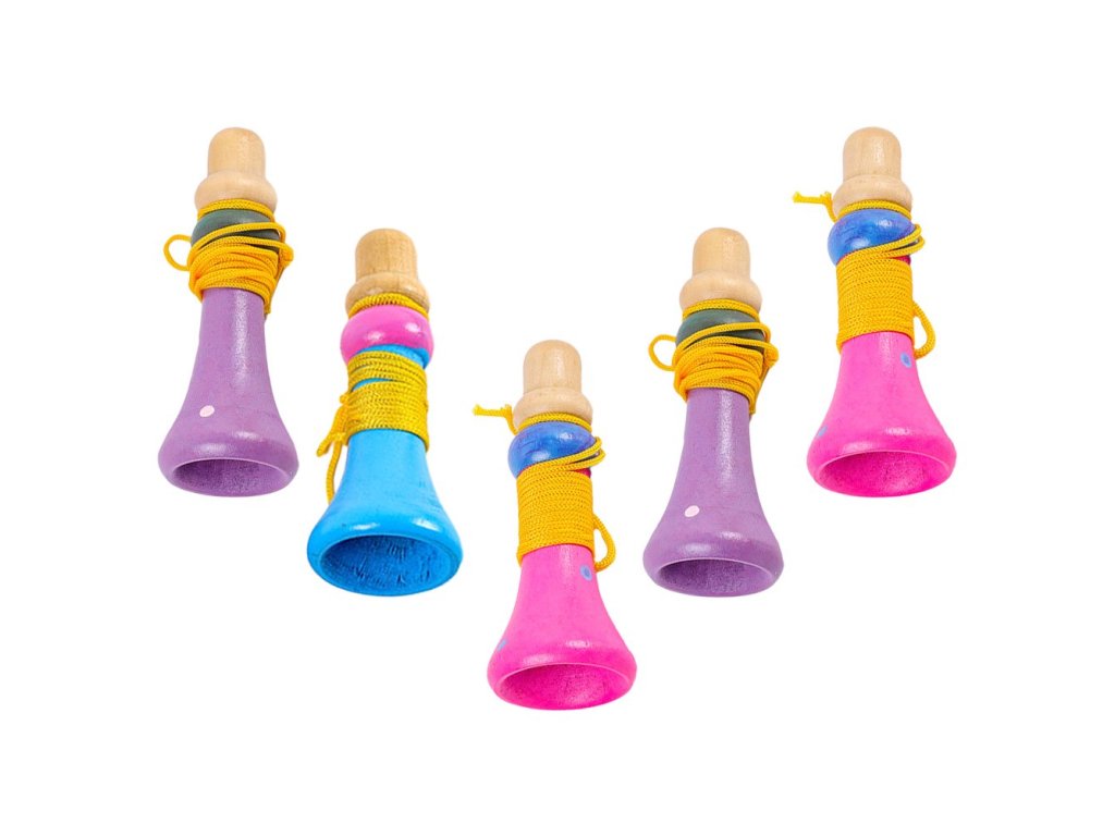 Dětské dřevěné trumpety s barevným lakem a praktickým provázkem pro zavěšení na krk nebo držení v ruce. Hračka vydává zábavný zvuk a podporuje hudební vnímání. Balení obsahuje 36 ks.