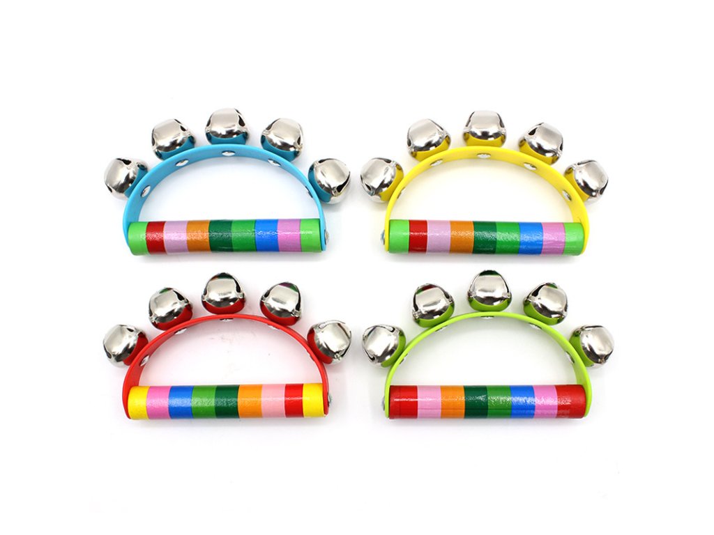 Barevné půlkruhové tamburíny s dřevěnou rukojetí a kovovými rolničkami. Hudební pomůcka pro děti, ideální pro rytmické hry a hudební výchovu. Balení obsahuje 12 ks v různých barvách.